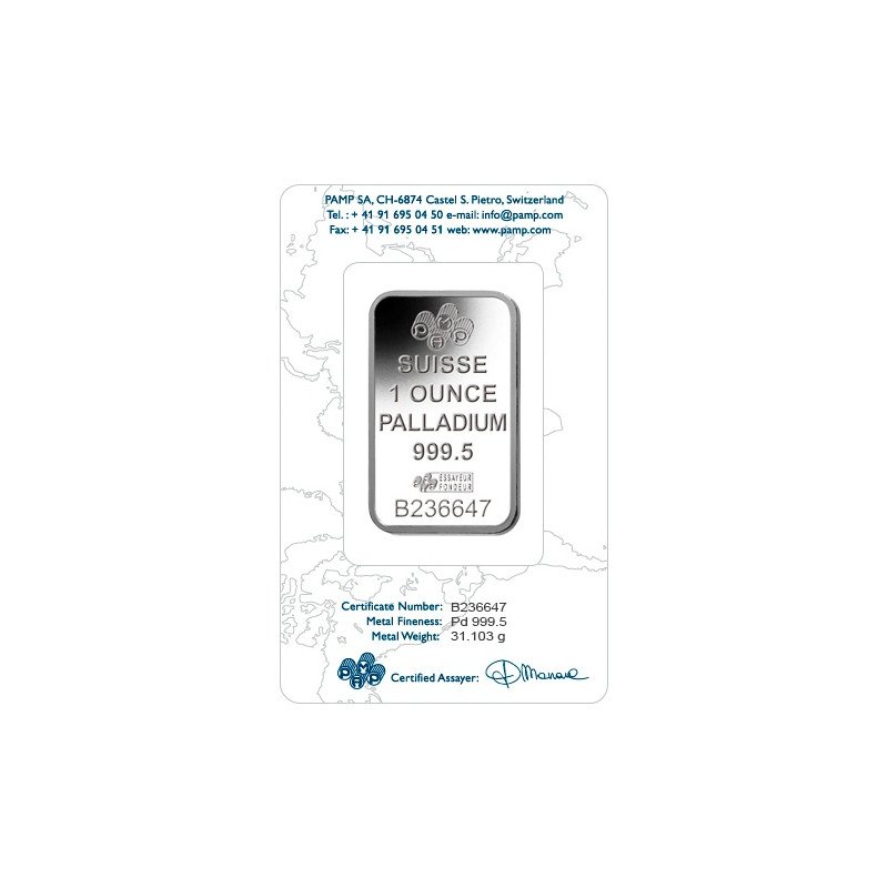 This minted 1oz pure Palladium bar has been manufactured by PAMP (Produits Artistiques Métaux Précieux), who were founded in Switzerland in 1977. PAMP is one the leading independent refiner of precious metals in the world. Packaged with certificate.
