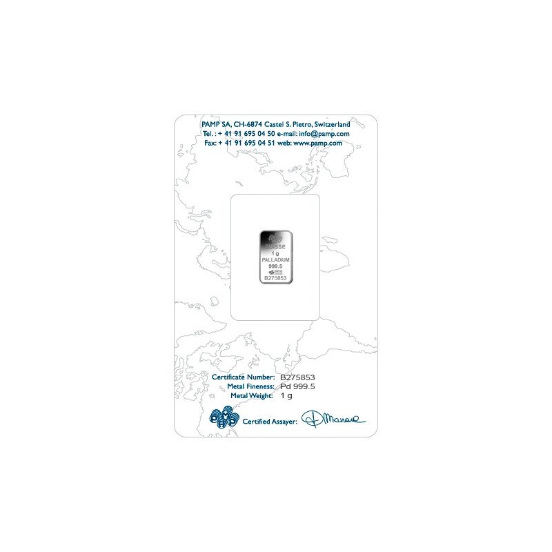 1 Gramm Feinpalladiumbarren vom Hersteller PAMP. Dieser 1 Gramm schwere Palladiumbarren ist mit dem berühmten Bild der Lady Fortuna versehen, das heute ein Synonym für PAMP ist. Mit seinem Zertifikat in einer praktischen Verpackung in Kreditkartengröße ist er ein perfektes Geschenk.