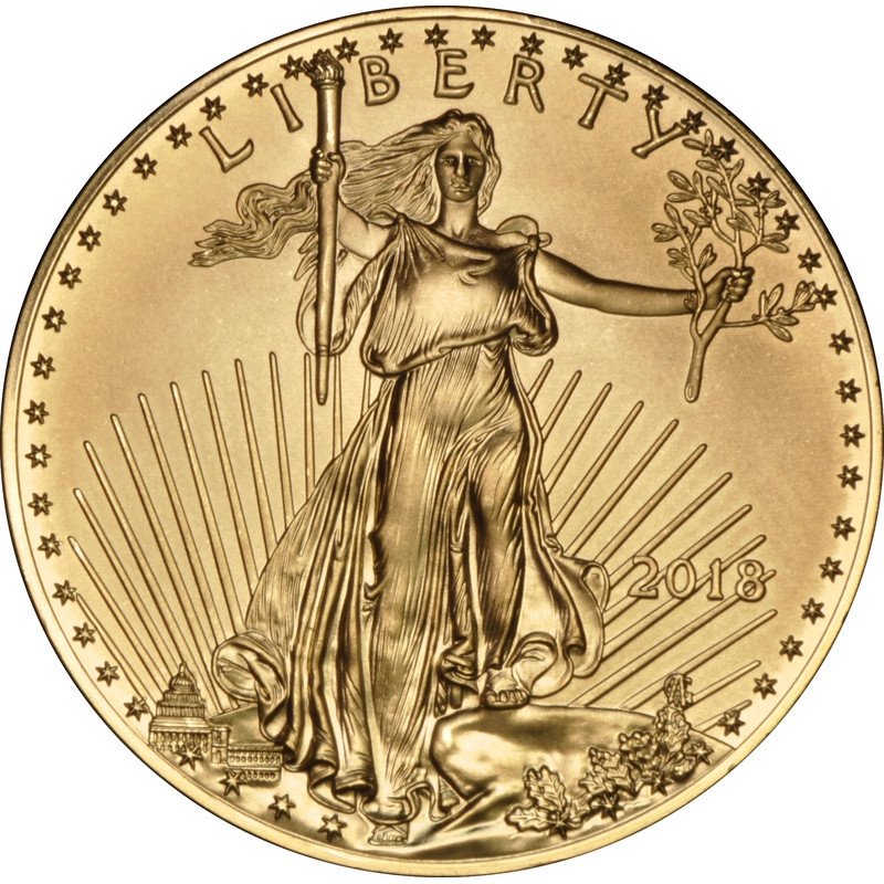 Auf der Vorderseite des Goldadlers ist die Freiheitsstatue mit wallendem Haar zu sehen, die eine Fackel und einen Olivenzweig hält. Es wurde ursprünglich von Augustus Saint-Gaudens für die limitierte Auflage der Double Eagle-Münzen der US Mint Anfang des 20. Jahrhunderts hergestellt.