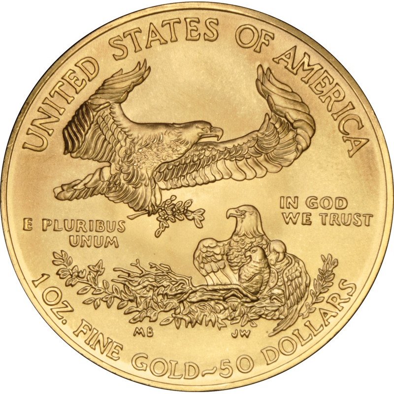 Die von der United States Mint hergestellte und 1986 eingeführte 1-Unzen-Goldmünze Eagle ist in 22 Karat Gold (.9167) geprägt und enthält 31,10 Gramm reines Gold.