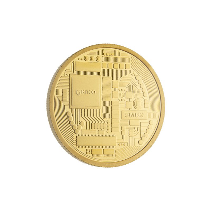 Die Vorderseite der Münze zeigt das De-facto-Bitcoin-Logo (ein Großbuchstabe B, der wie ein Dollarzeichen aussieht) in verspiegelter Ausführung. Das zentrale Design ist von feinen mattierten Linien umgeben, wie die Verdrahtung eines Computerchips. Das Gewicht und die Reinheit dieser 1 oz Goldmünze sind in einer Computercode-ähnlichen Schriftart viermal um den Außenrand herum eingeprägt.