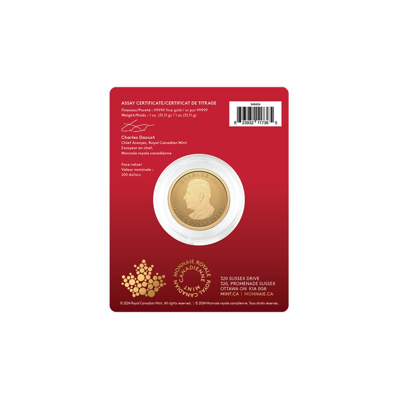 Unsere reinste Maple Leaf-Goldmünze zeigt das ikonische Gold Maple Leaf-Design (GML), ein Symbol für vertrauenswürdige Handwerkskunst. Strahlende Sonnenstrahlen werten das Design auf und erzeugen einen dramatischen und dynamischen visuellen Effekt. Jede Münze ist in einer stilvollen Kartenverpackung mit einer abnehmbaren Kapsel zur einfachen Handhabung verpackt, und auf der Rückseite der Karte befindet sich ein vom Chefprüfer der Münzanstalt unterzeichnetes Prüfzertifikat, das die Echtheit und Reinheit der Münze bestätigt.