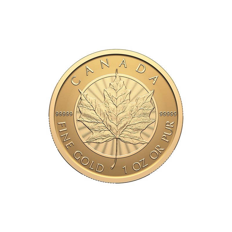 Rückseite: Zeigt das goldene Ahornblatt mit strahlenförmigen Linien sowie die Inschriften „CANADA“ zusammen mit dem Gewicht, der Reinheit und dem Metall.