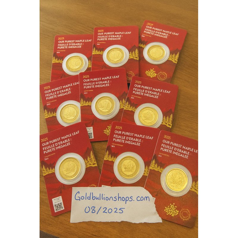 Die 2025 Canada 1 oz Our Purest Maple Leaf Goldmünze .99999 Fine (in Assay) ist der Gipfel der Goldreinheit und kombiniert unübertroffene Handwerkskunst mit Anlagewert. Sichern Sie sich diese Premiummünze von Bullion Exchanges und fügen Sie Ihrer Sammlung ein wirklich reines Stück Gold hinzu. Für weitere Hilfe wenden Sie sich gerne an unser Kundenserviceteam.
