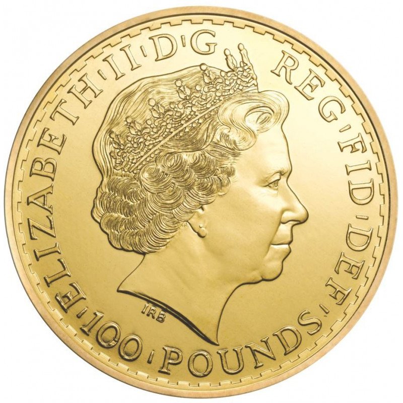 Each 1 oz Britannia is printed with a "face value"; This one ounce coin is set at "£ 100", although the value is of course based on the market price of its metal content.