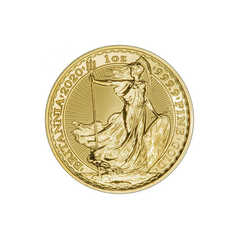Revers : représente l'image puissante de Britannia, une figure féminine casquée symbolisant la force et la fierté nationale. Le dessin de Philip Nathan présente Britannia debout, résolue, tenant un bouclier et un trident. Les inscriptions « 1 OZ FINE GOLD » et « 2020 » sont également affichées.