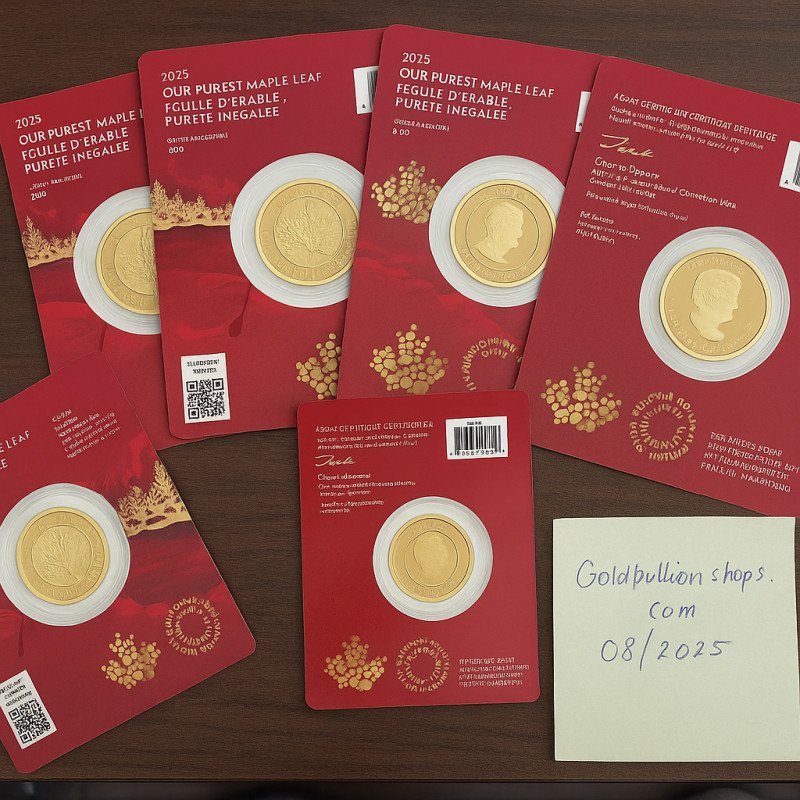 La pièce d’or Feuille d’érable canadienne 2025 de 1 oz Notre pièce d’or la plus pure à 99999, l’une des pièces d’investissement en or les plus pures disponibles sur le marché. Frappée par la Monnaie royale canadienne avec une pureté étonnante de 0,99999 (cinq neufs), cette pièce est un ajout passionnant à l’offre de lingots haut de gamme de la Monnaie. Présentant un poids garanti de 1 once troy, cette pièce d’or non mise en circulation offre aux investisseurs et aux collectionneurs l’accès à l’or le plus pur au monde dans un format pratique et magnifiquement conçu.