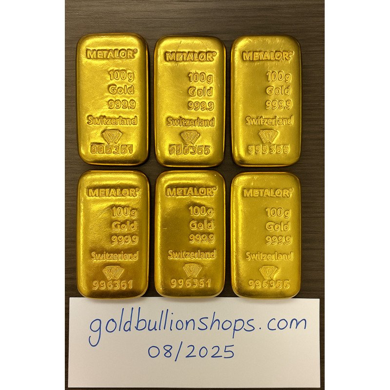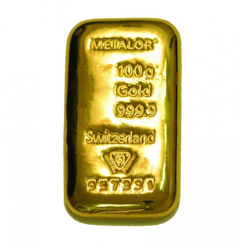 A gold 100g cast bar. The 100 gram is the main bar size for larger investors - it is quite sizable in terms of value, so multiples of this size bars offer flexibility over larger single bars when your time to sell arrives.