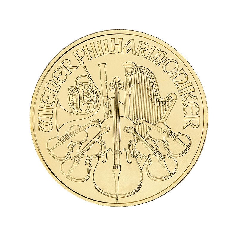 These 24-karat gold Vienna Philharmonic coin are legal tender minted by the Austrian Mint in Vienna. Inspired by the world famous Vienna Philharmonic Orchestra, the reverse depicts a beautiful blend of musical instruments from the Orchestra. These include a cello, four violins, a Vienna horn, a bassoon and a harp. They are arranged beneath the German name of the Orchestra, "Wiener Philharmoniker." On the obverse is the great organ in Vienna's Golden Concert Hall (Musikverein), as well as the weight and year of the coin.