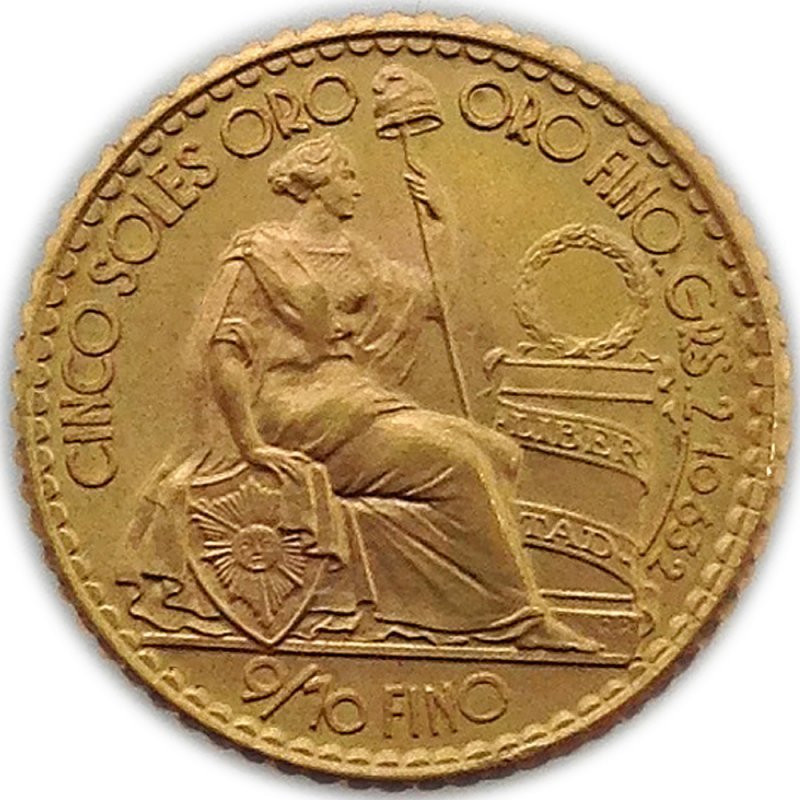 Oggetto da collezione (oggi): non più utilizzate nelle transazioni quotidiane, le monete d'oro da 5 Soles sono ora ricercate dai collezionisti e da alcuni investitori. Il significato storico, la coniazione limitata e il contenuto in oro rendono queste monete interessanti aggiunte a collezioni o portafogli.